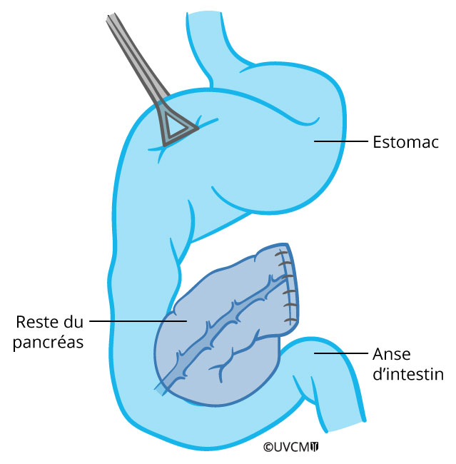 L'extrémité fermée du pancréas peut être placée sur une petite boucle intestinale.