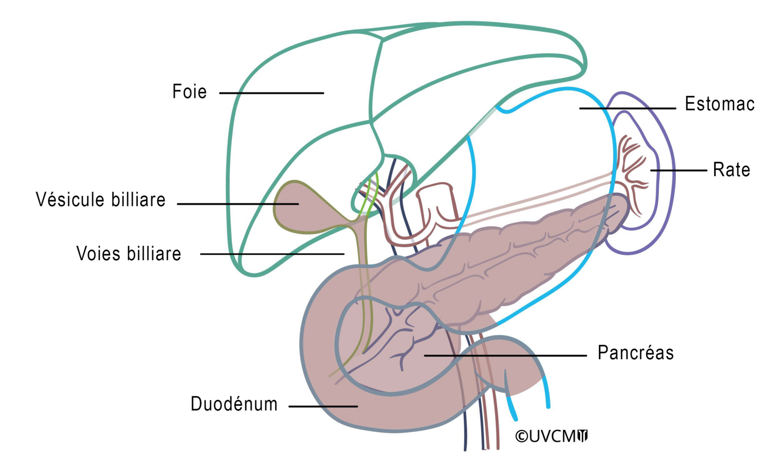 Situation après l'ablation complète du pancréas (il ne faut plus que 2 connexions/sutures chirurgicales)