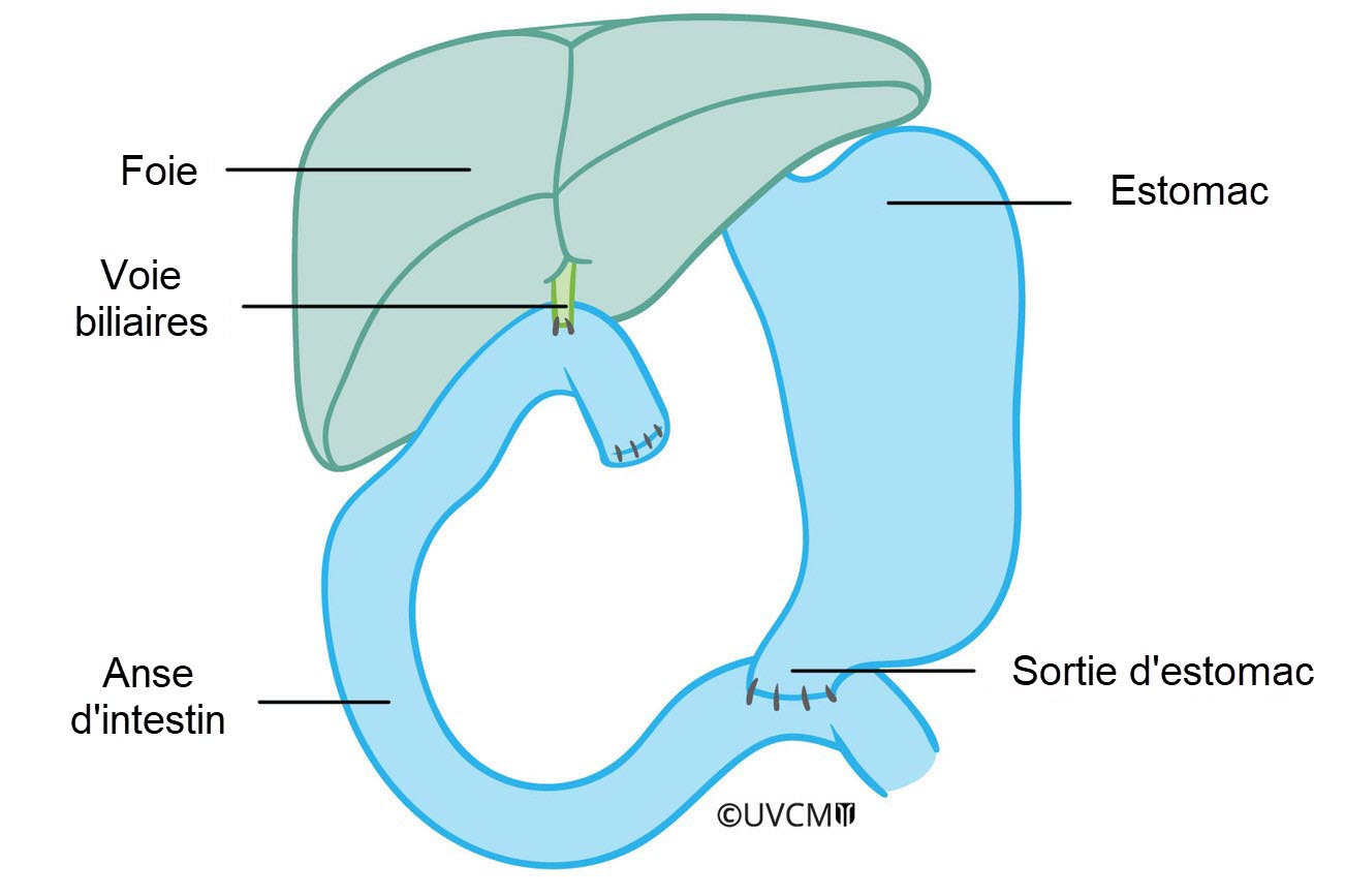 Après l'ablation de tout le pancréas, de certaines parties des voies biliaires, de la vésicule biliaire et du duodénum, la sortie de l'estomac est reliée à une anse de l'intestin grêle.